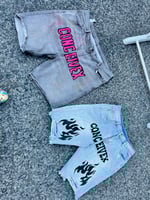unisex blue jean shorts with pink or black writing